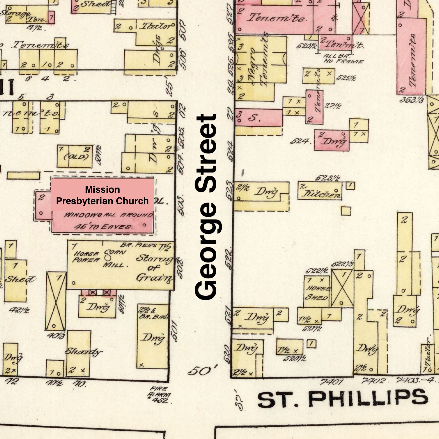 Sanborn Insurance Map of 1884 showing the location of Mission Presbyterian Church near the northeast corner of George and St. Philip Streets.