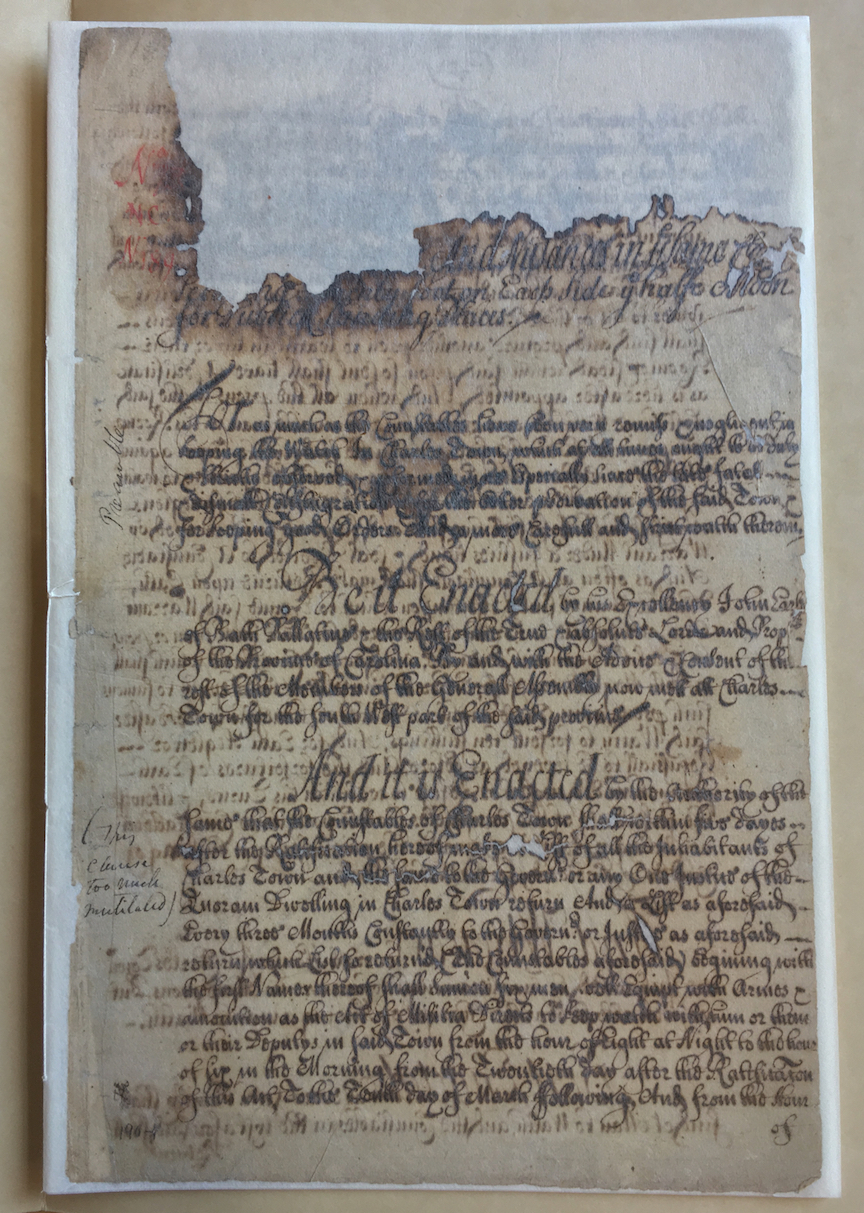 [4] See Act No. 133, “An Act to Appropriate the Moneys Raised and to be Raised by an Imposition on Liquors, &c. Imported into, and Skinns and ffurrs Exported out of this Part of this Province to a ffortification in Charles Town,” ratified on 16 March 1695/6. Statutes at Large, volume 7: 6–7, says sections 1–4 of Act No. 133 (that is, the really interesting bits) were “not to be found,” but the complete text is found among the engrossed acts of the General Assembly at SCDAH), in a volume known as “Governor Archdale’s Lawes,” pp. 84–87.