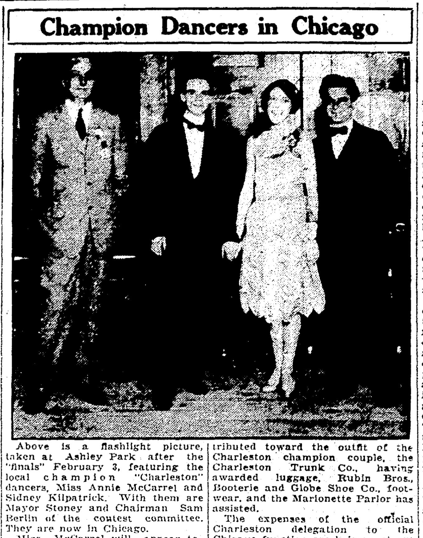 [11] Evening Post, 5 February 1926, page 2, “Two Couples to Chicago”; Evening Post, 6 February 1926, page 2, “Chicago Trip for Dancers”; News and Courier, 8 February 1926, page 1, “‘Charleston’ Party Speeds On Its Way to ‘Windy City’”; News and Courier, 9 February 1926, page 1, “All Chicago Knows about ‘Charleston.’”