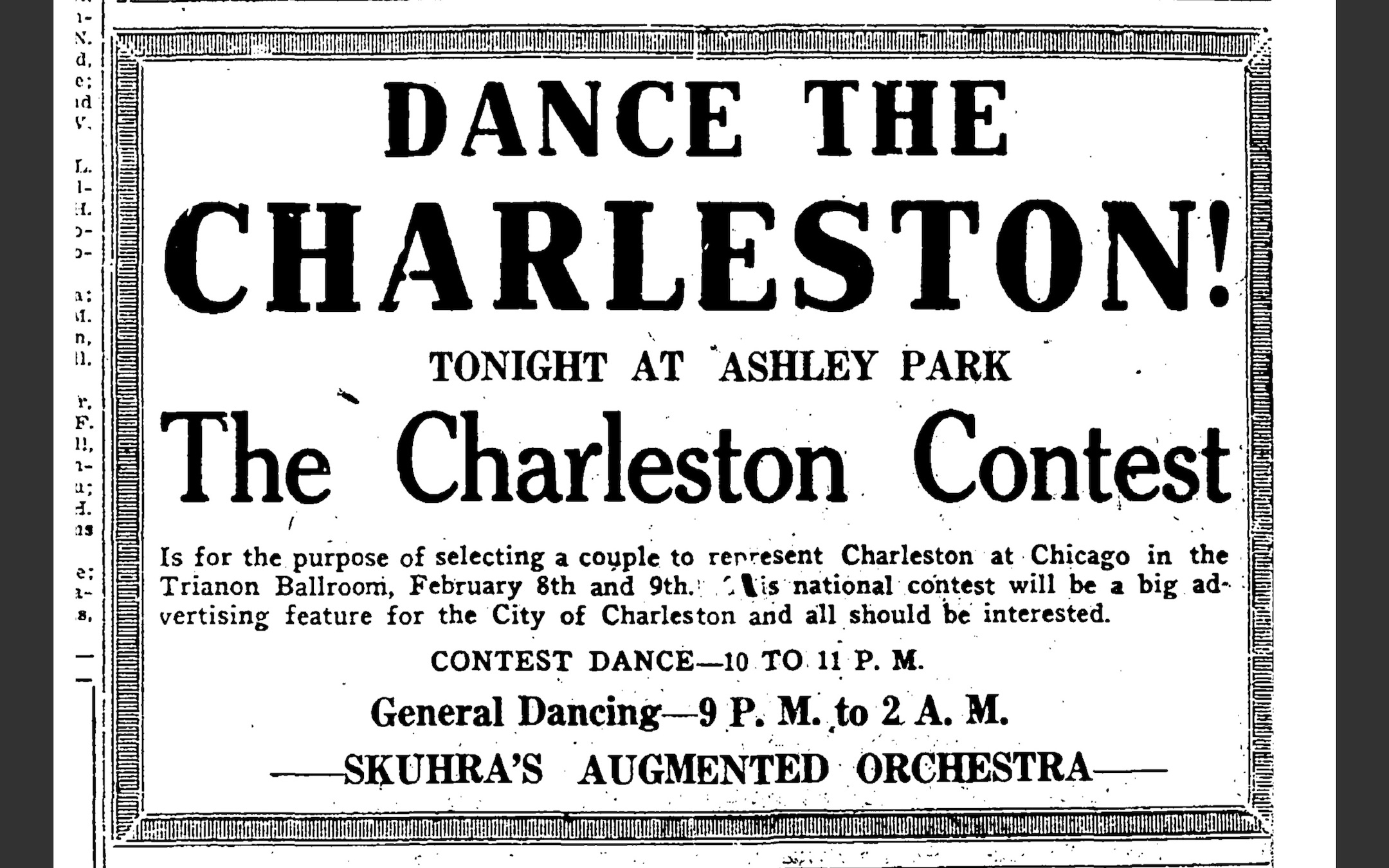 [8] Evening Post, 11 January 1926 (Monday), page 2, “First Contest At Ashley Park”; News and Courier, 12 January 1926, page 2, “Contest to Pick City Champions”; Evening Post, 14 January 1926, page 3, “Preliminary Contest Held”; Evening Post, 18 January 1926, page 12, “Elimination Dance Tuesday”; Evening Post, 21 January 1926, page 10, “3rd Contest On Tonight”; Evening Post, 22 January 1926, page 5, “2 Additional Charlestoners”; Evening Post, 25 January 1926, page 12, “Preliminary On Thursday”; Evening Post, 27 January 1926, page 11, “Last of Four Preliminaries”; Evening Post, 28 January 1926, page 12, “Last Chance to Qualify.”