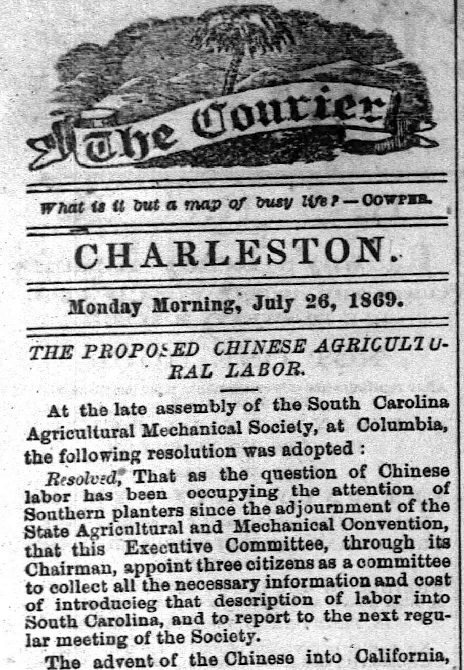 [3] Charleston Daily Courier, 7 July 1869, page 2, “Chinese Immigration and the Problem of Labor.”