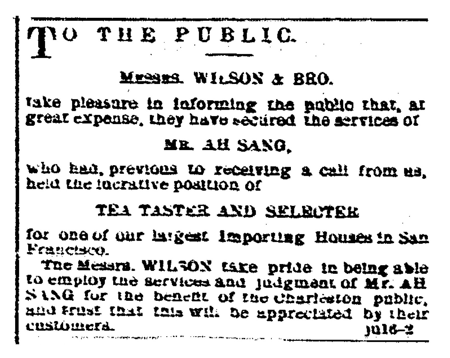 On July 16th, 1873, the day after his arrival in Charleston, the Wilson brothers placed a notice in the local newspaper announcing their connection with the young Chinese national: “At great expense, they have secured the services of Mr. Ah Sang, who had, previous to receiving a call from us, held the lucrative position of Tea Taster and Selecter [sic] for one of the largest importing houses in San Francisco. The Messrs. Wilson take pride in being able to employ the services and judgment of Mr. Ah Sang for the benefit of the Charleston public, and trust that this will be appreciated by their customers.”[20]