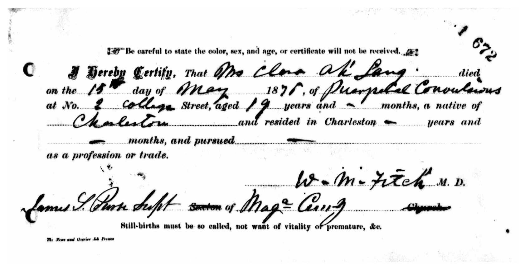 [30] According to the Return of Deaths within the City of Charleston (held in the Charleston Archive at CCPL), Mrs. Clara Ah Sang, a nineteen-year-old white, female, native of the City of Charleston, died at 2 College Street on 15 May 1876 of “puerperal convulsions” and was buried at Magnolia Cemetery. Clara’s death certificate is found on microfilm in the S.C. History Room at CCPL, and online through Ancestry.com.
