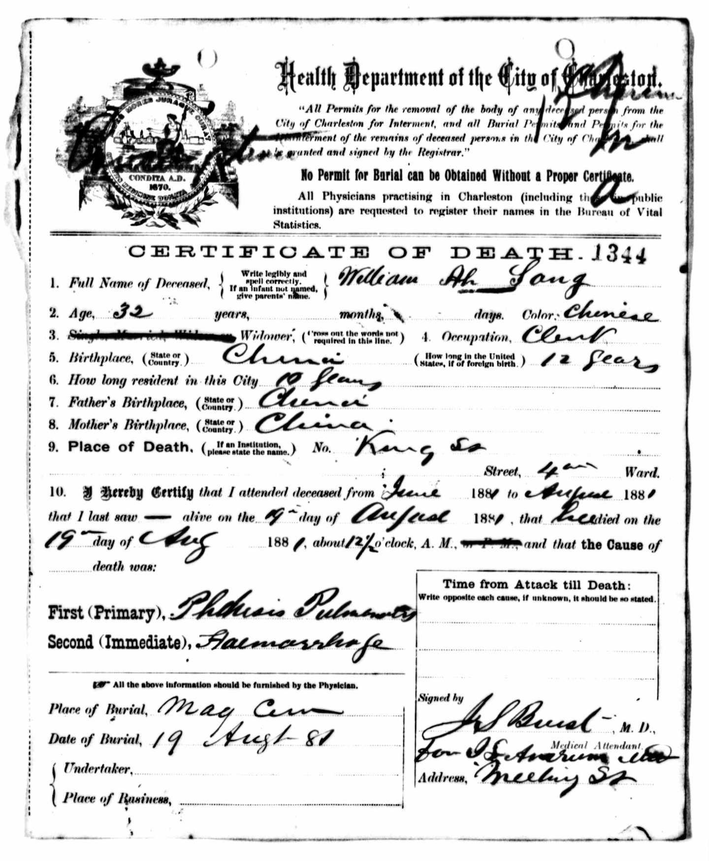 [33] News and Courier, 20 August 1881 (Saturday), page 1, “The Death of Ah Sang.”