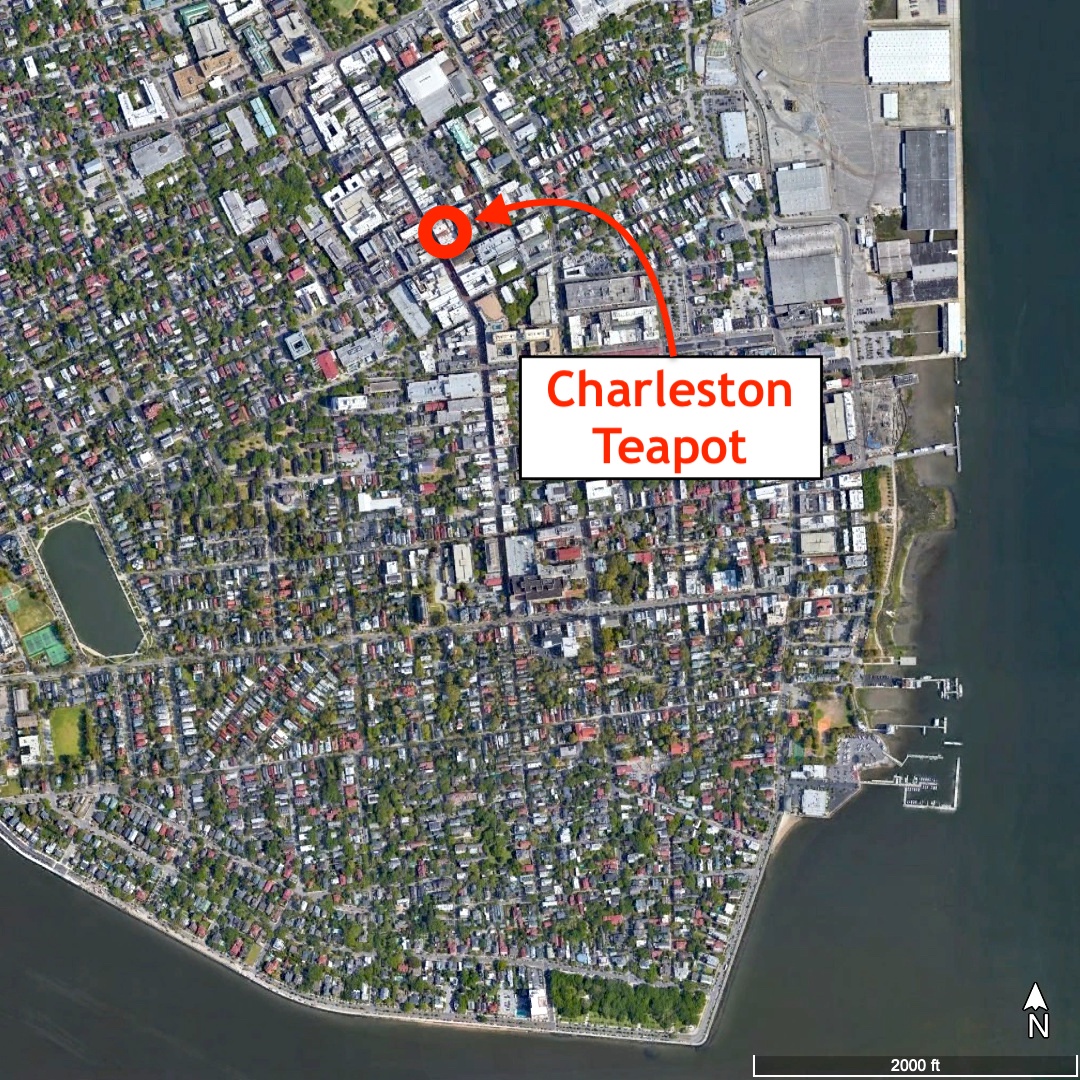 William Ah Sang might have been the first person of Chinese ancestry to settle in Charleston, but he was not the first of his kind in South Carolina.[23] As I described in Episode No. 232 and No. 233, Oqui Adair had settled in the Palmetto State in 1857 and had been employed as a gardener in Columbia since 1864. To differentiate the two men in the autumn of 1873, the Wilson brothers informed the public that they employed “the only educated Chinaman in South Carolina.”[24] Oqui apparently adopted American-style clothing and hairstyle shortly after his arrival in the United States, but it appears that William Ah Sang did not. Although it is possible that he continued to wear a long pigtail or queue and loose-fitting garments out of devotion to his Chinese ancestry, the traditional Asian aesthetic of that era might have been essential to his career in Charleston. Ah Sang was a novelty in the Palmetto City at that moment, and his employers might have encouraged him to maintain his distinctive appearance as a means of promoting their business. Consider, for example, the illustrated advertisement for the Charleston Teapot first published in July 1874, which depicts two pig-tailed figures in the foreground, opening the lid of an enormous teapot, with several similar figures flying through the air in the background.[25] Pedestrians passing the Wilson brothers’ establishment in King Street would have seen Ah Sang through the shop’s window, and the firm directed the public to find the store at the “sign of the Live Chinaman.”[26] In the summer of 1874, however, the Wilson brothers suspended a large, sheet-metal teapot above the sidewalk of their King Street facade, belching steam generated by coffee-roasting machinery on the second floor above the shop.[27]