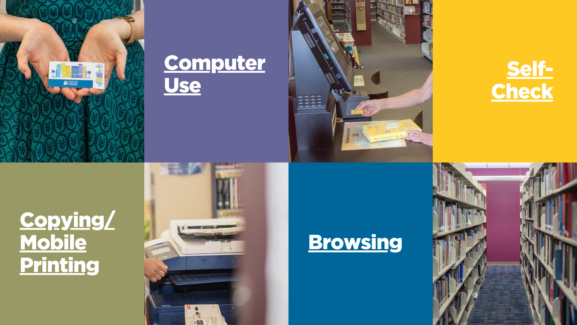 - Picking up items placed on hold and check out of bundled items. This includes items placed on hold available from the Holds Shelf and book bundles of curated staff selections.