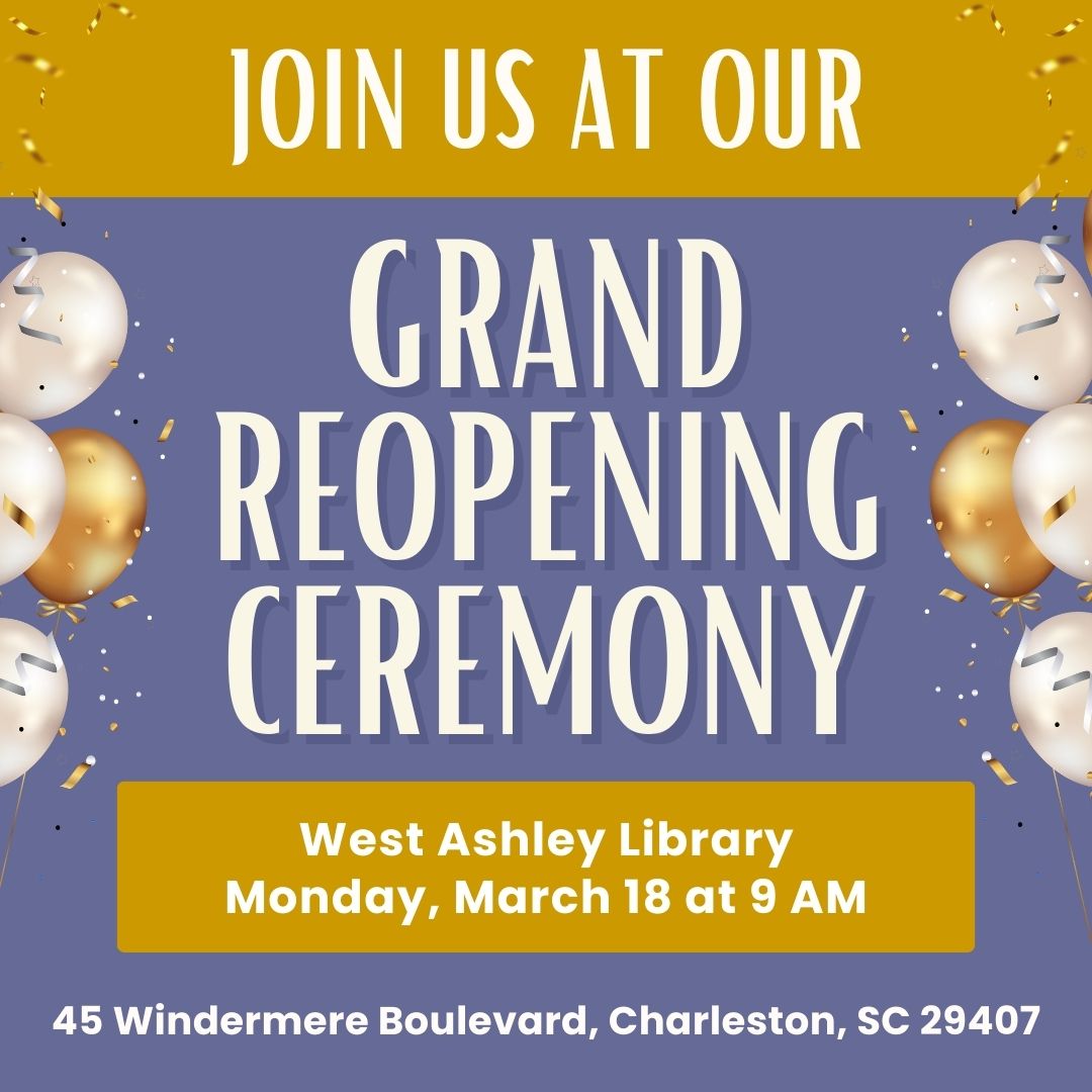 CHARLESTON, SC – Charleston County Public Library (CCPL) will open the renovated West Ashley Library, located at 45 Windermere Blvd, on Monday, March 18. The public is invited to attend a ribbon cutting ceremony beginning at 9 a.m. at the branch.
