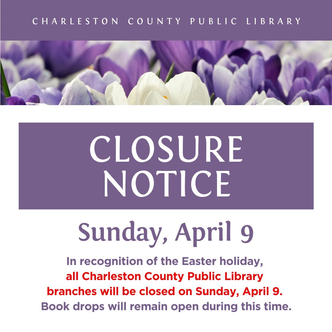 All Charleston County Public Library branches and offices will be closed on Sunday, April 9 in observance of Easter.