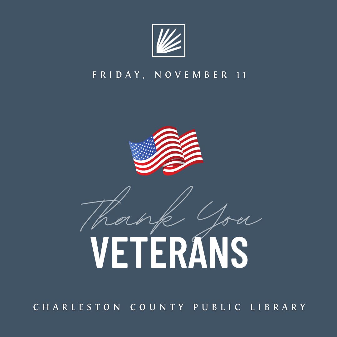 In recognition of Veterans Day, all Charleston County Public Library branches will be closed on Friday, November 11th, 2022. Book drops will remain open during this time.