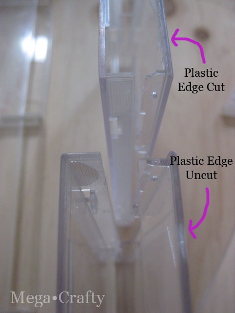 In order for the roof to lay flat against the end walls the plastic edge on the short side of the case (the part that’s opposite the hinge) needs to be cut off. Here I’ve shown one cd with the plastic cut off next to another cd with the plastic still on.