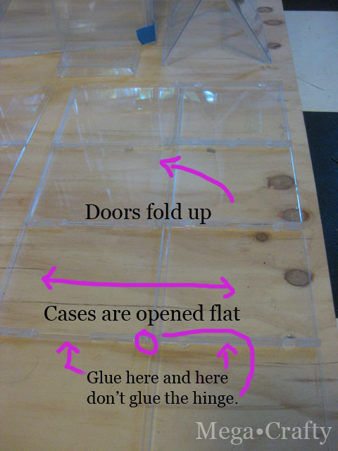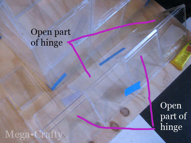 Before gluing anything lay the cases out and decide if the hinges are going to be on the left or the right. And remember the open space near the hinge I mentioned? Make sure on each case that open space faces down, that way you’ll have one side of each wall that’s smooth solid plastic.