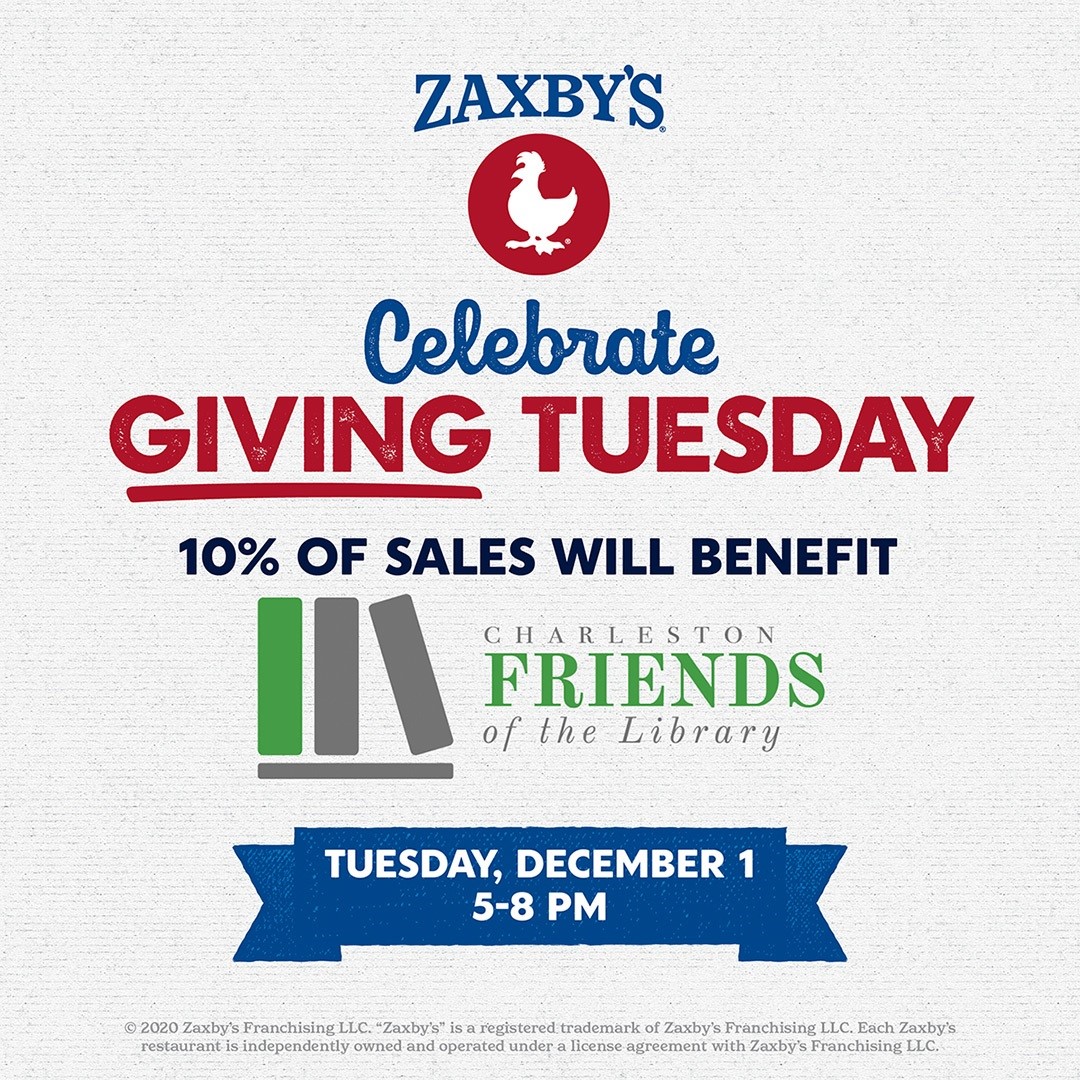 Another way you can support the Friends on Giving Tuesday this year is by eating dinner at Zaxby's. On December 1st from 5-8 PM, 10% of sales from three local Zaxby's locations will be donated to the Charleston Friends of the Library.