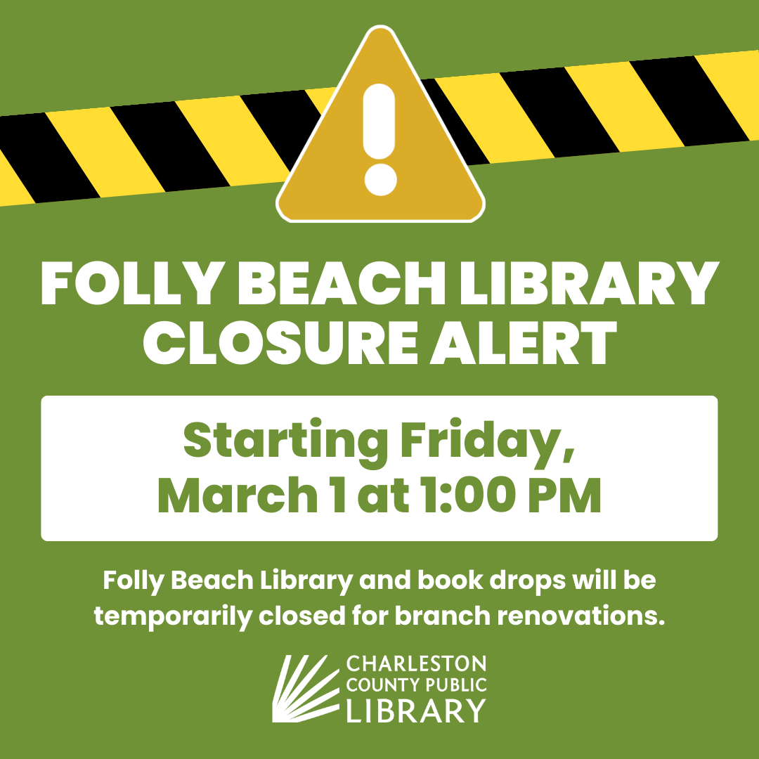 CHARLESTON, SC – Charleston County Public Library (CCPL) is closing the Folly Beach Library, located at 55 Center St, on Friday, March 1 at 1 p.m. to undergo renovations as part of the ongoing referendum-funded project. The library will receive an interior refresh including new paint, technology upgrades, and furniture. The renovations are expected to take several months to complete.