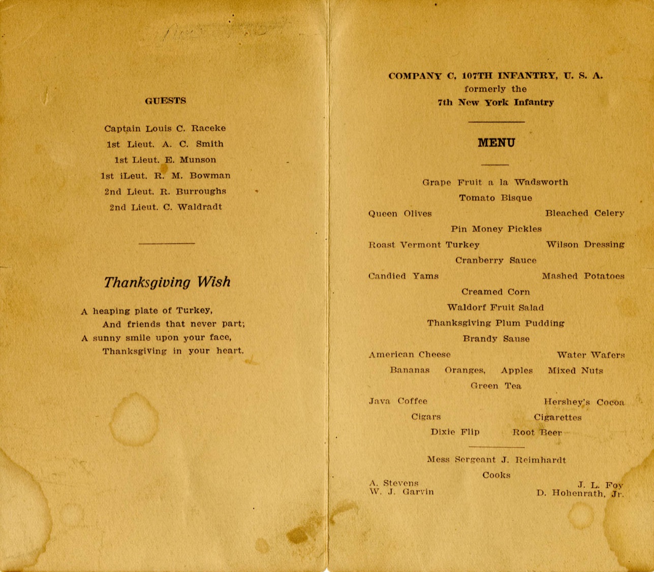 As a result, there are a number of Thanksgiving Day menus in library archives around the country, including a meal for the troops station in South Carolina. The troops of Company C in the 107th Infantry at Camp Wadworth in Spartaburg, South Carolina, in 1917, were treated to a traditional Thanksgiving spread -- just like their families at home.