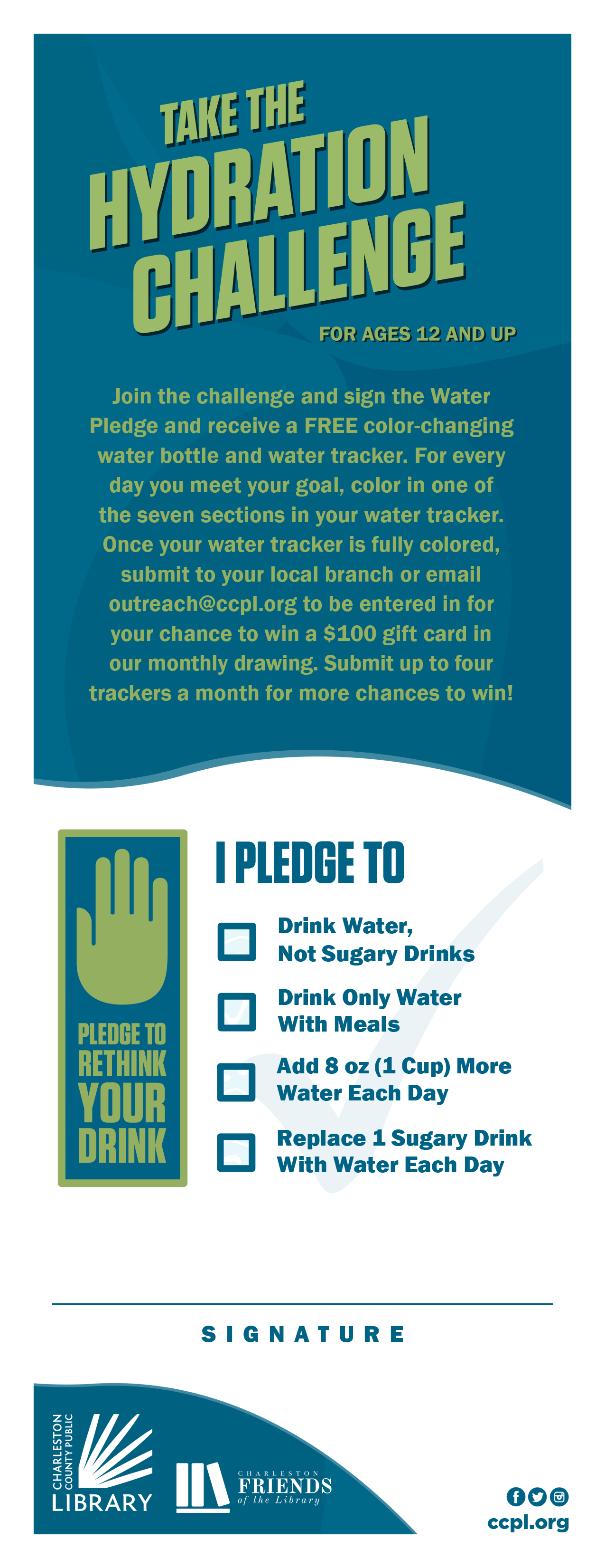 Patrons 12 and older can receive a free CCPL color-changing water bottle and have a chance to win a $100 gift card by drinking more water and reducing the number of sugary drinks consumed.