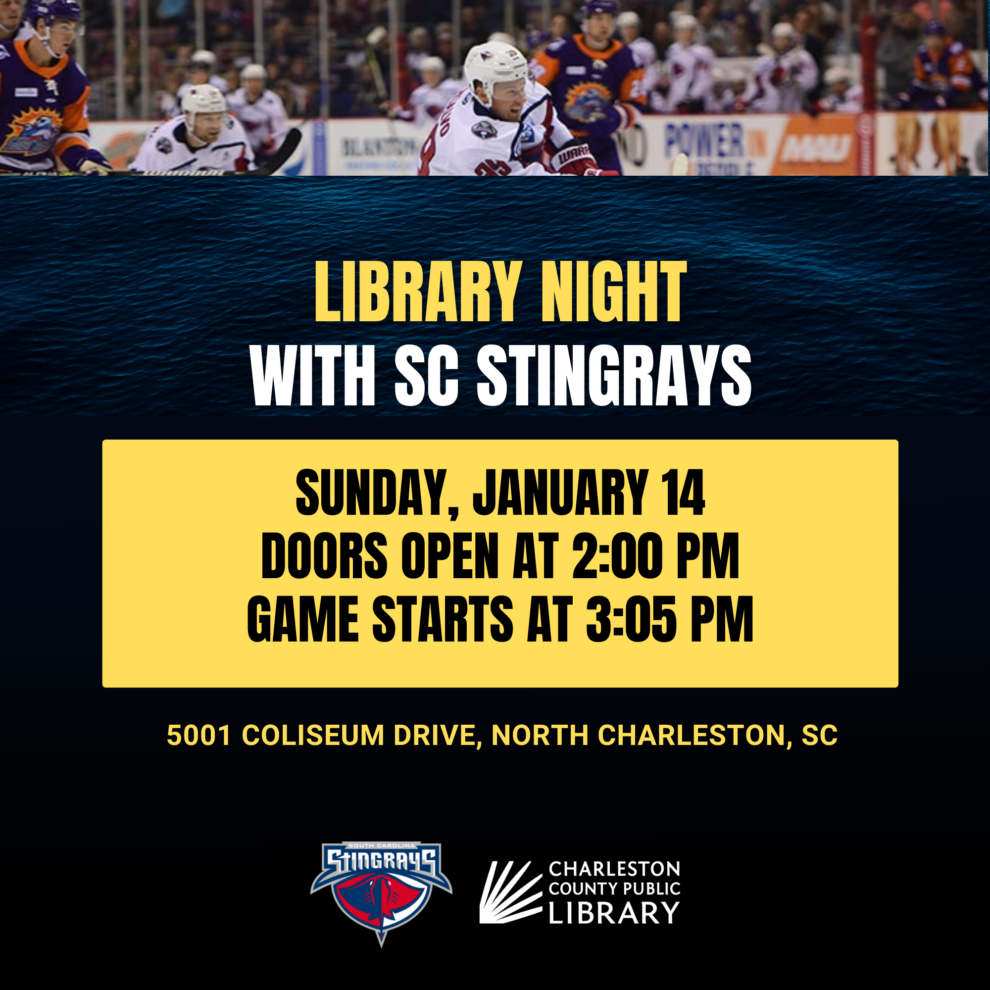Join the Charleston County Public Library and the South Carolina Stingrays hockey team for Library Night and Kids Takeover Day! The game is Sunday, January 14 at 3:05 p.m. at the North Charleston Coliseum located at 5001 Coliseum Drive, North Charleston, SC. The doors open at 2:00 p.m.