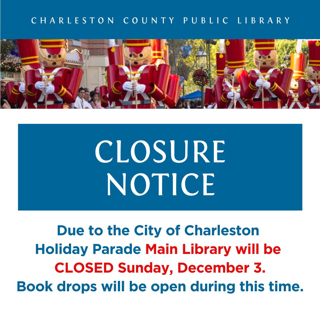 Due to the City of Charleston Holiday Parade, Main Library will be closed on Sunday, December 3. Book drops will remain open during this time.