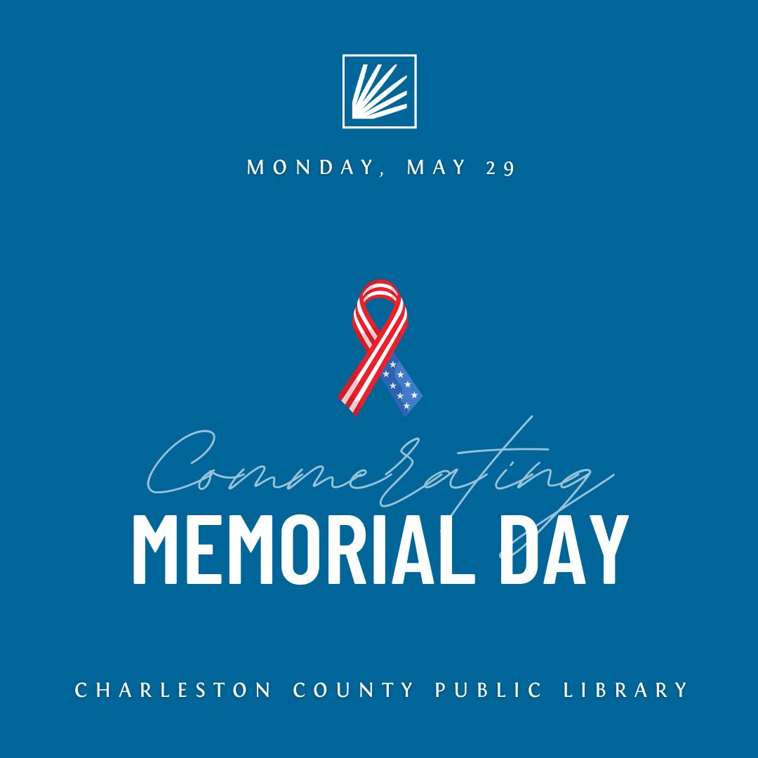 Article Date May 25, 2023 All Charleston County Public Library branches and offices will be closed in observance of the Memorial Day holiday on Monday, May 29. Bookdrops will remain open duing this time.