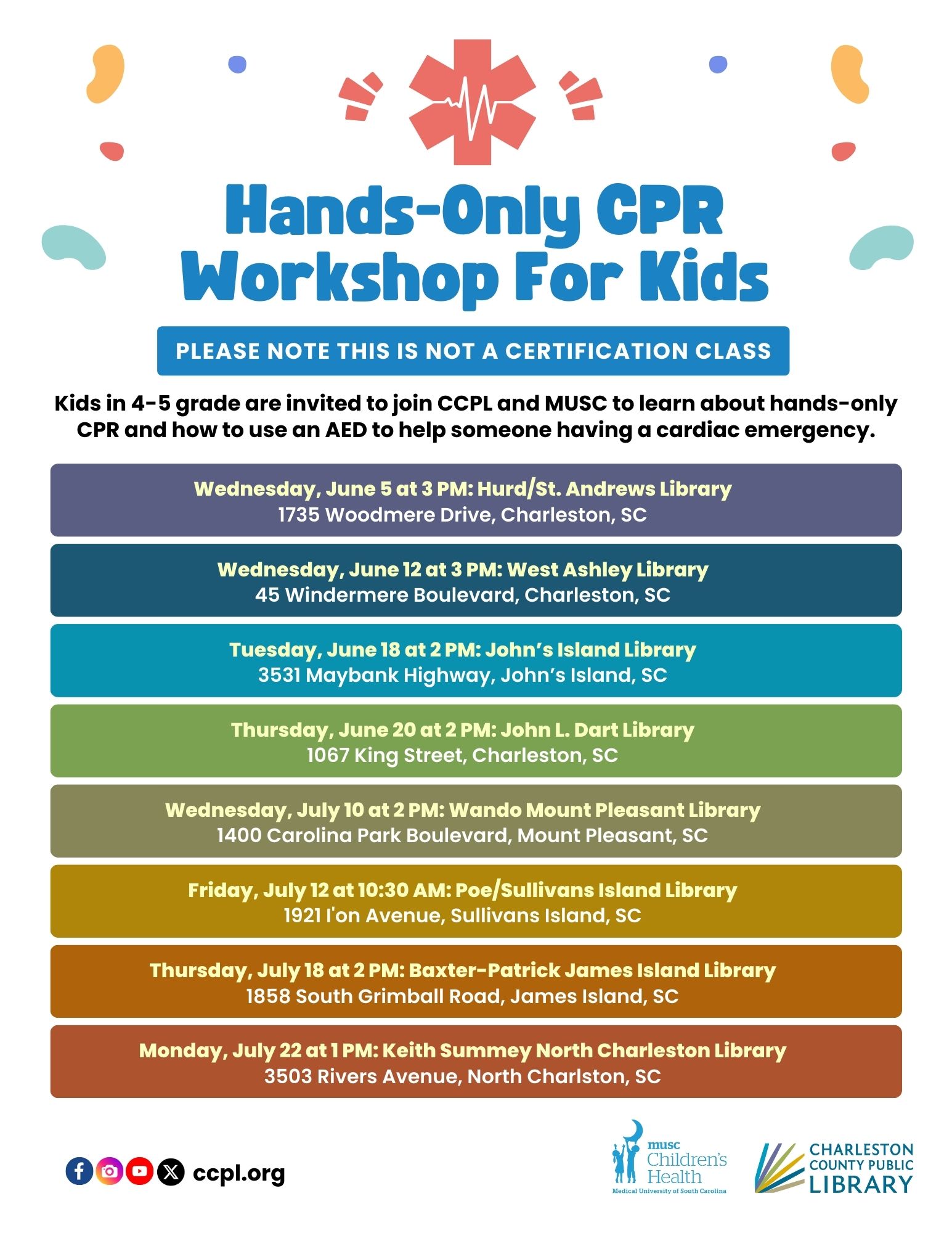 For kids in grades 4 – 5. Join CCPL and MUSC at select branches to learn hands-only CPR and how to use an
