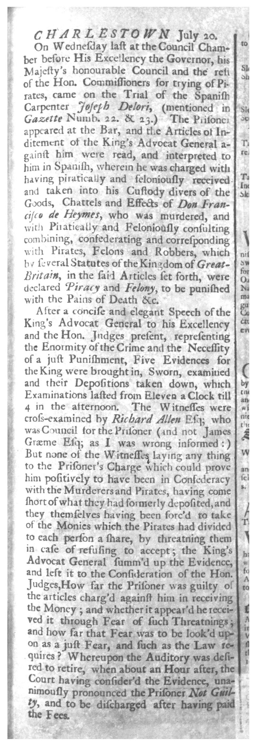 The formal trial of Joseph Lortia commenced on the sultry morning of July 17th with Attorney General Abercromby reading aloud again the tedious summary of the British statutes and commissions concerning piracy and the revised charges against the Hispanic prisoner. In a subsequent edition of the weekly South Carolina Gazette, Lewis Timothy sarcastically described Abercromby’s opening statement as a “concise and elegant speech.” The king’s prosecutor sought to impress on the court the “enormity of the crime” allegedly committed by Joseph Lortia, and the necessity of rewarding it with capital punishment. The defendant heard a translation of the charges against him and entered a plea of not guilty. With the arraignment finally completed, the court heard sworn testimony from six witnesses, each of whom was questioned and cross-examined in turn without a midday break for dinner.