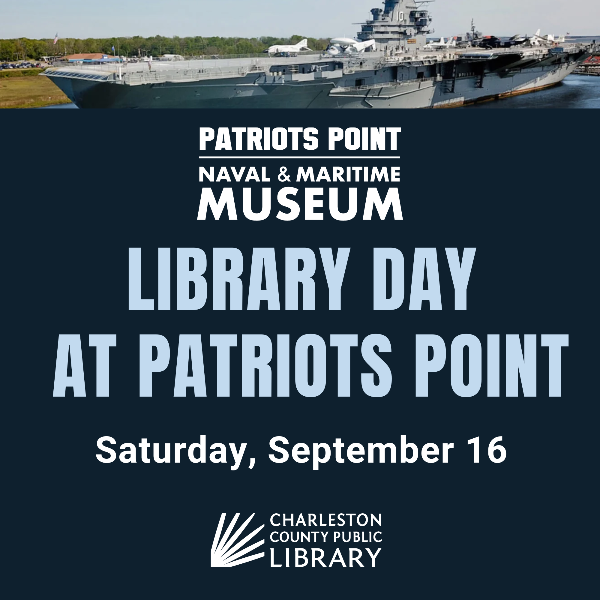 Join us for Library Day at Patriots Point on Saturday, September 16, 2023! It's a community event in partnership with the Charleston County Public Library and Patriots Point Naval and Maritime Museum celebrating history and reading. Event festivities are from 10 a.m. until 12 p.m. and will include storytimes, hands-on history, and giveaways! Join us for storytimes and special programming on the USS Yorktown.
