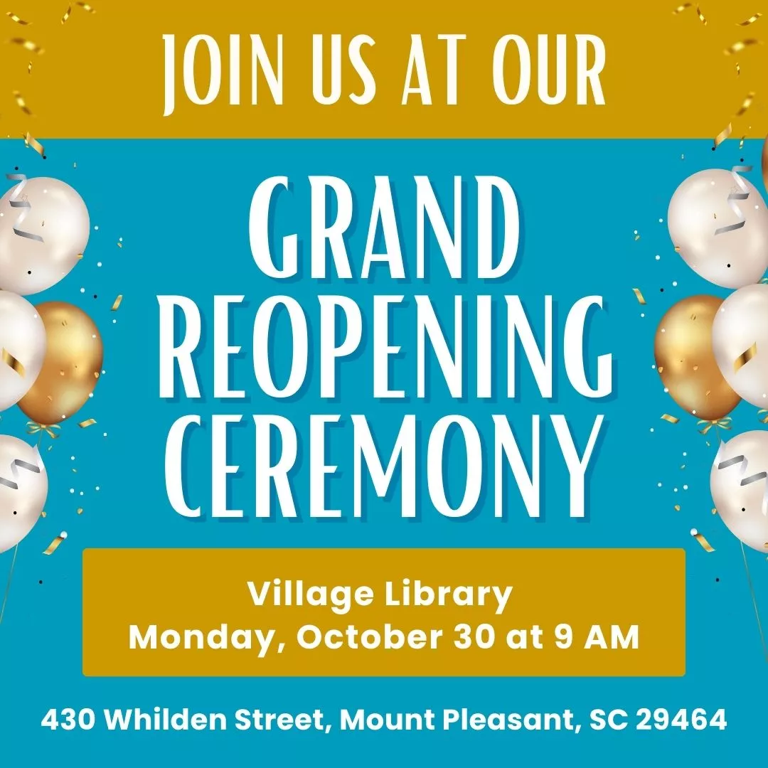 Charleston County Public Library (CCPL) will open the renovated Village Library, located at 430 Whilden St in Mount Pleasant (map), on Monday, Oct. 30. The public is invited to attend a ribbon-cutting ceremony beginning at 9 a.m. at the branch. “We...