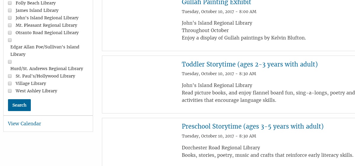 The calendar view lets you pare down the results, and you can also get a listing for month, week and day, which means you can quickly put together a list of things to do at your local branch.